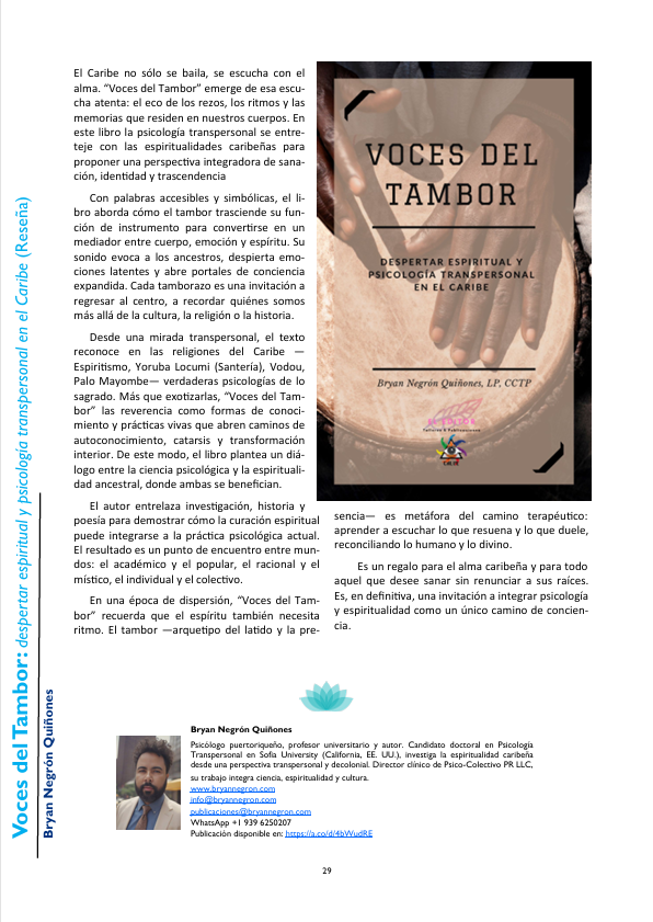 El libro Voces del Tambor: Despertar Espiritual y Psicología Transpersonal en el Caribe fue reseñado en la Magazine #15 de la Asociación Transpersonal Iberoamericana (ATI), una publicación internacional del ámbito transpersonal.La reseña resalta la integración entre psicología transpersonal, espiritualidad caribeña y sanación ancestral a través del simbolismo del tambor.🔗 Ver publicación: